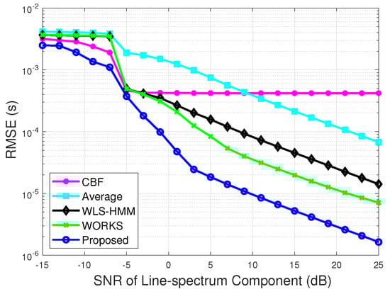 The effectiveness of the proposed method has been verified in the previous simulation. In this simulation, we analyze the impact of SNR of the line-spectrum component on the time-delay difference estimation accuracy of the proposed method. The estimation accuracy of time-delay difference is evaluated in terms of the root mean square error (RMSE) defined as