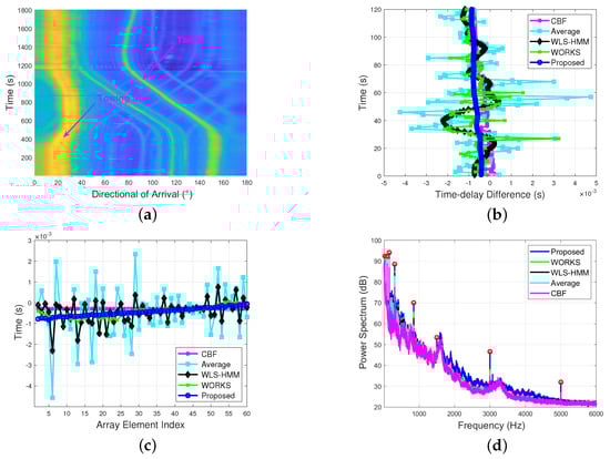 Figure 8a presents the direction time record during a turn of the towing ship. It is observed that the towing ship starts the turn at the time of 300 s and ends the turn at the time of 1250 s. Without loss of generality, we select 120 s of data starting from the time of 1000 s as an example to verify the effectiveness of the proposed method. Five line-spectrum components with frequencies of 36 Hz, 97 Hz, 157 Hz, 310 Hz, and 3000 Hz are detected from the pre-enhanced signal based on the hypothetical uniform linear array. Figure 8b shows the estimates of the time-delay difference between the first two hydrophones for 120 frames of observation. Figure 8c presents the estimates for the inter-hydrophone time-delay difference of the towed array at the 67th observation. As seen from Figure 8b,c, whether in time dimension or space dimension, the time-delay difference estimates in the proposed method exhibit a smaller fluctuation compared to those in other three methods.