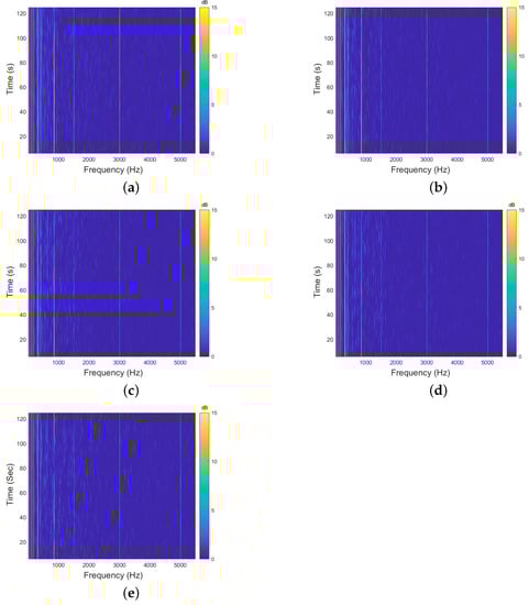 Figure 8d presents the average for the power spectrum of the enhanced signal in 120 frames of observation. To quantify the signal enhancement performance, the amplitude gains between the line-spectrum components in the power spectrum for the considered four methods and those in the power spectrum based on the hypothetical uniform linear array are listed in Table 3. Note that the improvement by using the proposed method is evident, particularly for the line-spectrum components with frequencies larger than 100 Hz. The time-frequency spectrum of the enhanced signal for different methods are presented in Figure 9a–e. It is observed that the line-spectrum components in the time-frequency spectrum of the proposed method have higher amplitudes than those in the time-frequency spectrum of other four methods. It is consistent with the results shown in Figure 8d and Table 3.