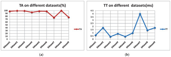 (a) TAs of the four different classifiers based on the same graph feature set and (b) TTs of the four different classifiers based on the same graph feature set.