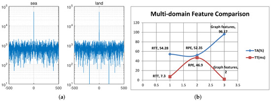 (a) Doppler amplitude spectra of sea and land clutter. (b) TA and TT of RTT/RPE/ Graph features combined with SVM.