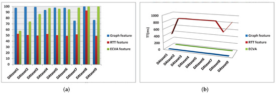 It can clearly be seen that the testing accuracy based on the proposed feature set and ECVA feature set remains higher than that of the RTT. Furthermore, the results on the graph feature set maintain stable performance when the average energies of the two types of clutter are close (dataset 1 dataset 6), which is a challenging task in previous work. As shown in Figure 8b. The training time based on our proposed feature set is also very efficient.
