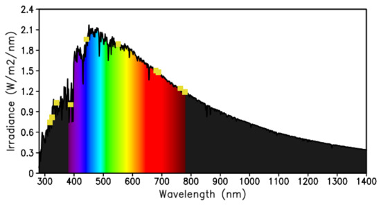 Spectral solar irradiance at the top of atmosphere. Yellow rectangles indicate the wavelengths of the peak spectral response functions in each of the ten EPIC channels.