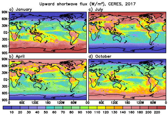 Upward shortwave flux at TOA (W m−2) distributions from CERES in (a) January, (b) April, (c) July, and (d) October in 2017.