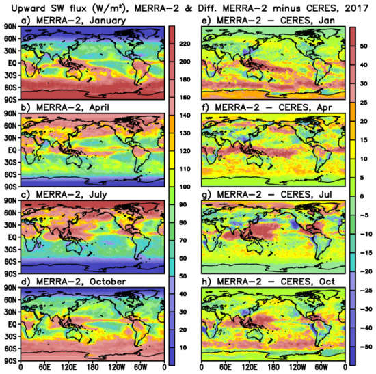 Left: Distribution of upward shortwave flux at TOA (W m−2) from MERRA-2 in (a) January, (b) April, (c) July, and (d) October in 2017. Right: Difference in upward shortwave flux between MERRA-2 and CERES (MERRA-2 minus CERES) in (e) January, (f) April, (g) July, and (h) October in 2017. MERRA-2 fields are regridded onto CERES grid to compute the differences.