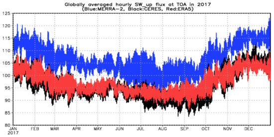 Time evolution of globally averaged upward shortwave flux at TOA (hourly, W m−2) from CERES (black), MERRA-2 (blue), and ERA5 (red) in 2017.