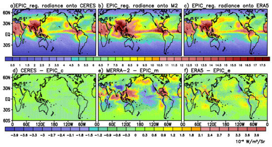 Global distribution of the regressed DSCOVR/EPIC shortwave radiance (10−8 W m−2 Sr−1) (no inclusion of contribution from error term) onto (a) CERES, (b) MERRA-2, and (c) ERA5 radiance in boreal spring 2017. Distribution of differences in radiance between (d) CERES and regressed EPIC radiance onto CERES (EPIC_c), (e) MERRA-2 and regressed EPIC radiance onto MERRA-2 (EPIC_m), and (f) ERA5 and regressed EPIC radiance onto ERA5 (EPIC_e). Differences are regridded onto 1° longitude ×1° latitude grid.