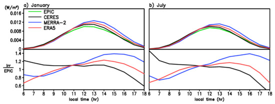 In this section, we investigate shorter timescale (i.e., diurnal cycle) variation of SW radiation from EPIC, CERES, MERRA-2, and ERA5 to quantify their relative differences. Diurnal cycle of Earth’s reflected irradiance (global integral of radiance, see Section 3.1) is plotted in Figure 9 as a function of local solar time to address how realistically the CERES, MERRA-2, and ERA5 reproduce the observed peak time and shape of diurnal cycle revealed by EPIC. Diurnal cycle over the globe from EPIC clearly shows the maximum peak at noon in winter and summer (green lines) due to the high solar elevation that implies a strong solar illumination. It was also found from EPIC observations that cloud cover—a key factor in regulating reflectance—has a daily minimum around local noon [44]. While CERES (black line) produces the diurnal cycle quite close to EPIC in January, two reanalyses (blue and red lines) lag the maximum peak by an hour, along with overestimation (Figure 9a). The exaggeration of diurnal amplitude lasts through afternoon as the ratio of reanalysis irradiance to that from EPIC remains above 1 in the afternoon (lower panel in Figure 9a).