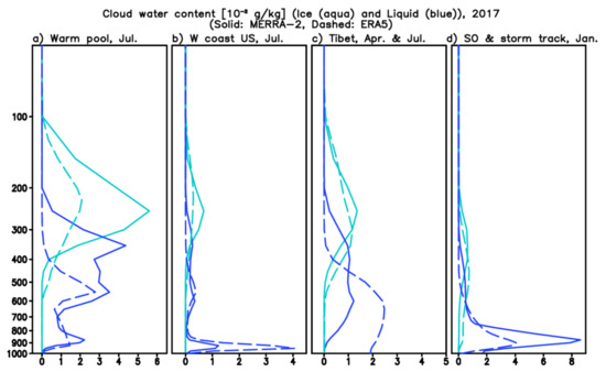Vertical profile of cloud ice water content (aqua) and cloud liquid water content (blue) over the same regions, (a) tropical western Pacific warm pool, (b) off the western coast of US, (c) Himalaya/Tibet, and (d) Southern Ocean and storm track in midlatitude Southern Hemisphere, selected in Figure 10. Sold lines denote the results from MERRA-2, while dashed lines are the results from ERA5. The unit is 10−2 g kg−1.
