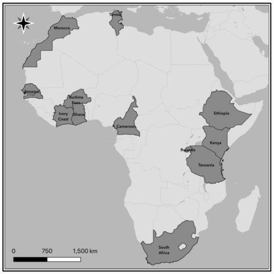 Map showing the 13 African countries investigated (dark grey color) in this study.
