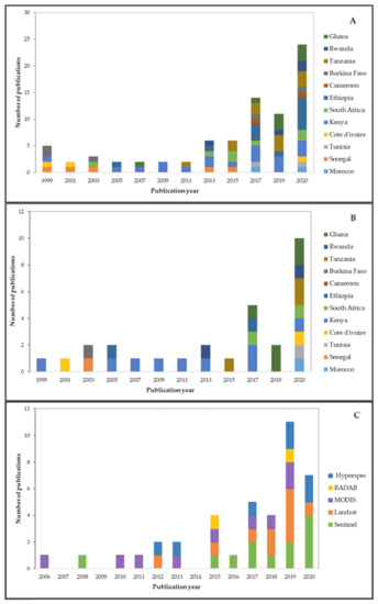 Stacked bar charts show the number of annual publications between 1998 and 2020 in Africa in the Scopus database that have: (A) “Yield gap” in their title, abstract, or keywords; (B) “Yield gap” and “at least one soil property” in their title, abstract, or keywords. (C) The primary platform or sensors used for the yield gap assessment.