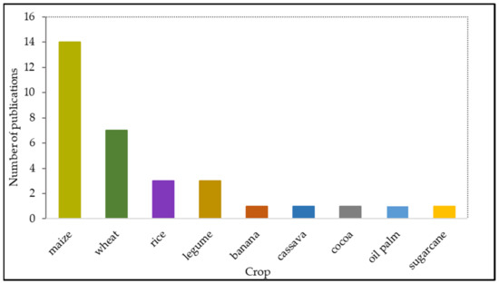 In term of the crops investigated with regard to yield gap (Table 2), maize was the most studied crop, with five publications, followed by other crops, such as banana and cassava, with one paper each (Figure 4). Overall, between 1998 and 2020, cereals were the most important crop investigated on a continental scale, with maize as the most important crop, followed by wheat and rice (Figure 4). The remaining cultures were researched in relation to the major culture of each country: i.e., cocoa in Ivory Coast, cassava in Kenya, and palm oil in Ghana.