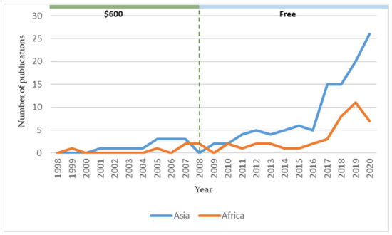 Number of annual publications in the selected Africa and Asian countries from 1998 to 2020 found in the Scopus database with the “Landsat” keyword in their title, abstract, or keywords.