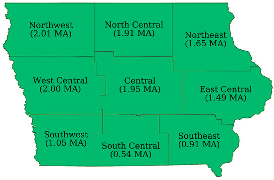 Agricultural Statistical Districts in Iowa with average corn acreage planted over the study period in million acres (MA) [25].