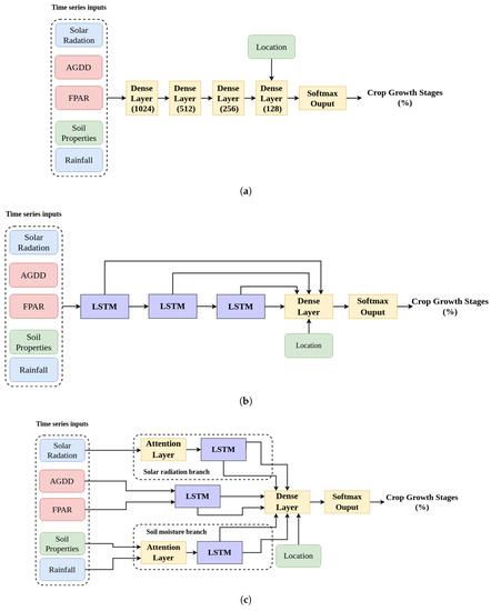The NNs in this study were based upon Long Short-Term Memory (LSTM) layers [33], which are widely used in sequence identification/classification problems, such as speech recognition, translation, and time series prediction [34]. LSTM has also found success in RS studies, including crop classification [11] and yield prediction [35]. In this study, LSTM was used because of its ability to handle time series data with variable length gaps between key events [36], such as variable in-season crop growth data. Three NN implementations were investigated, two reference structures and a third NN that incorporated domain knowledge. The two reference structures included a dense NN, with traditional dense layers of decreasing size (Figure 3a) and a sequential NN in which LSTM layers were linearly chained (Figure 3b).