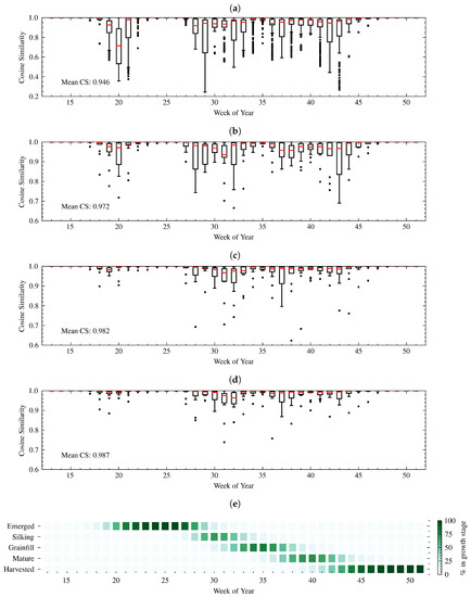 In this study, CS is used as a metric for the accuracy of each NN in describing crop progress across all stages for a single week. CS ranges from −1 to +1, representing vectors that are exactly opposite in direction to exactly the same in direction. Orthogonal vectors have a CS of 0. A CS value of 1 means that the CGSE method produces perfect estimates of the amount of corn in each growth stage for that week. Lower CS values indicate higher discrepancies between estimated and real crop progress across all stages for that week.