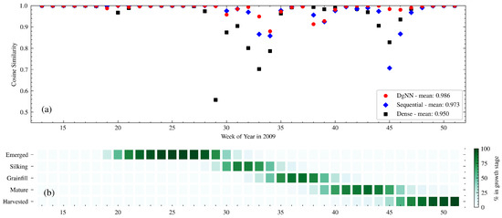 Figure 5, Figure 6, Figure 7 and Figure 8 show the CS for the four test years. Dense NN CS values for the test years, particularly 2009 (Figure 5) and 2012 (Figure 6), were lower than the range produced during cross-validation. While the Sequential NN was able to produce more accurate overall estimates of all-stage crop progress (as measured by CS) during some of the most difficult periods for all models, it also suffered greater CS performance degradation than the other NNs during some CGS transition periods. The DgNN maintained the highest CS for some of the most difficult periods, such as the Grainfill–Mature–Harvested transitions, during the test years for all NNs. The DgNN was also less prone to CS performance drops during the start and end of the Emergence stage, which were particularly pronounced for the other models in 2009 (WOY 29–30) and 2014 (WOY 18–19). In addition, as seen in Table 6, the DgNN produced the best estimates across all growth stages for the greatest number of weeks in each of the test years, producing the highest CS value for 39% more weeks than the next best NN.