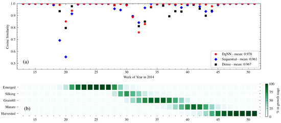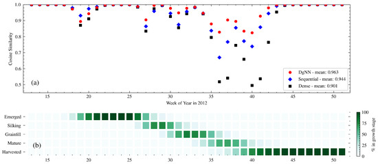 Overall, the DgNN showed significant improvement in estimating CGS over the HMM and the other two NNs, particularly in Mature stage NSE and in CS for weeks with multiple overlapping stages. However, the DgNN had reduced NSE for Silking during evaluation due to difficulty in estimating the timing of the Silking–Grainfill transition. Given the higher Silking NSE of the Sequential NN during evaluation, future studies may be able to combine the strengths of both NNs through ensemble methods such as boosting (e.g., [55]) or estimation averaging (e.g., [56]).