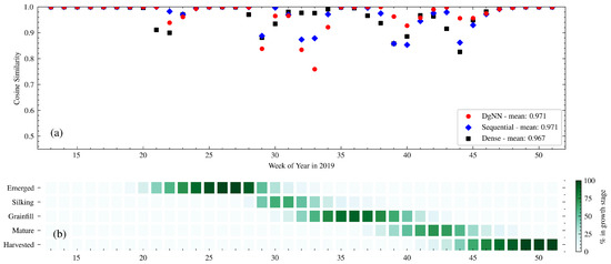 (a) Week-to-week CS between actual and estimated crop progress for the NNs in 2019; and (b) actual crop progress for 2019 is shown below.