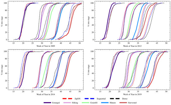 Table 7 shows NSE performance for each of the test years. For the 2009 test year, the DgNN outperformed all other models, with the highest NSE for all stages except Emerged. Similar to what was seen during model validation, all NNs had reduced performance during the stages where corn transitioned into and out of Silking (see Figure 5). The Dense NN showed greater performance degradation than the LSTM-based NNs during this period, with significantly lower CS from WOY 29–34. There was a decrease in CS due to a delayed harvest around WOY 45, a time when close to 100% of the crop had been harvested for every year represented in the training data. The Sequential NN was the worst affected. The DgNN, however, suffered very little decrease in CS during that week. Figure 9 shows cumulative crop progress for each stage for each of the years. During 2009, each of the three NNs was early in estimating progress for every stage except Emerged.