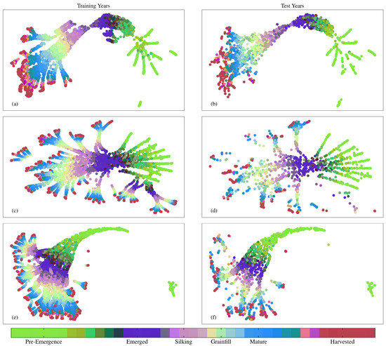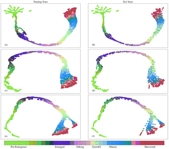Figure 10 and Figure 11 show layer activations for the final layers of each NN preceding their respective 128 node and softmax layers. Layer activations have been reduced using UMAP and labeled stages in the colorbar represent the height of each new stage. Figure 10 illustrates how the LSTM-based NNs treat the time series differently from the Dense NN. Each of the separate branches visible in the activation space for both the DgNN and Sequential NN contain time series from a specific ASD. The Dense NN, however, does not keep time series from different ASDs as separate, even though it is given the same location information. This may be a source of performance boost for the LSTM-based models, as test year data is projected into the activation space closer to other data from the same ASD. Regression performed by final layers to estimate crop progress is then more strongly influenced by training time series from the same region. This is a benefit as farmers in different ASDs elect to plant cultivars with traits more suited to the local climate. As such, regression performed in an activation space that keeps different ASDs more separate may be more robust to inter-season variation.