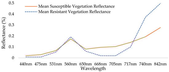In addition to thermal extraction from the Zenmuse XT2, extractions of NDVI and a 3-band composite image from the Red-Edge MX Dual Camera system were also made to serve as comparisons. By using the Spectral Profile tool within ArcGIS, the reflectance of glyphosate-resistant vegetation and glyphosate-susceptible vegetation were compared at each of the ten bands provided by the Red-Edge MX Dual Camera system.