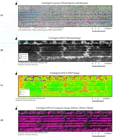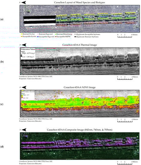 The objective of this study was to identify herbicide resistance after glyphosate application in true field conditions by analyzing the thermal and multispectral response of weed species of waterhemp (Amaranthus rudis), kochia (Kochia scoparia), common ragweed (Ambrosia artemisiifolia), and redroot pigweed (Amaranthus retroflexus).
