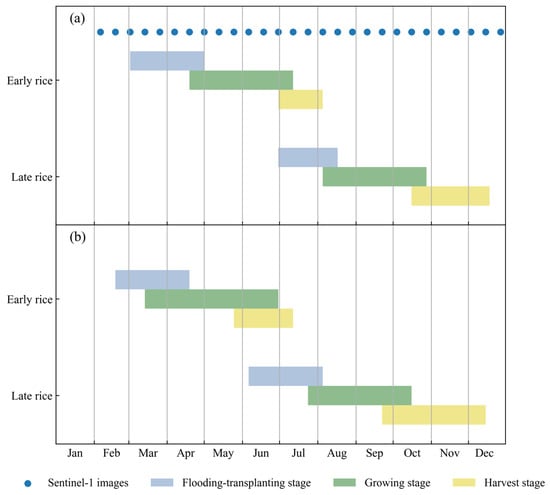 Rice cropping calendar and Sentinel-1 image acquisition dates at Guangdong, Guangxi, Hunan, Jiangxi, Fujian provinces, Hubei, Anhui, Zhejiang provinces (a) and Hainan province (b).