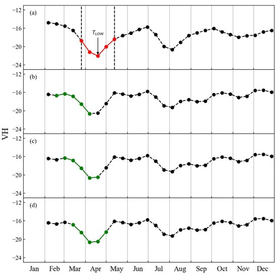 We used a simple random sampling approach to select 100 field investigated paddy rice pixels in each province and extracted the time series of the VH curves during the potential flooding-transplanting and early growing stages. Then, we first detected the lowest values of the VH curves from the flooding-transplanting stages to first half periods of the growing stages of early rice and generated the standard VH curves for five time periods: the time of the lowest VH value (TLOW), two times prior to TLOW and two times after TLOW, totally covering about 60 days (Figure 4a, red curve). In the investigated pixels, we used a moving window covering 60 days to extract the time series of VH from the flooding-transplanting stages to first half periods of the growing stages (Figure 3) and calculated the dissimilarity values by comparing them with the above 100 standard curves. Figure 4 shows how to calculate the dissimilarity values of an unknown pixel compared with one standard curve of early rice in Guangdong Province. Firstly, we generated a standard curve of early rice from a known double-season rice pixel (Figure 4a, red curve). Secondly, we extracted the time series of VH from the unknown pixel with a moving window covering 60 days (Figure 4b–d). In Guangdong Province, the flooding-transplanting stages to the first half periods of the growing stages were from March to April (Figure 3a), so there were three moving windows—18 Feb to 7 Apr (Figure 4b, green curve), 2 Mar to 19 Apr (Figure 4c, green curve), 14 Mar to 1 May (Figure 4d, green curve); we extracted three time series from the same pixel (Figure 4b–d, green curve). Thirdly, based on TWDTW, we calculate the dissimilarity values by comparing the standard curve (Figure 4a, red curve) with each of the three time series (Figure 4b–d, green curve). As a result, we obtained three dissimilarity values. Comparing with 100 standard curves, we calculated a total of 300 dissimilarity values for each unknown pixel, and the lowest dissimilarity value (ERmin) was selected to represent the degree of dissimilarity between the unknown pixels and known early rice pixels.