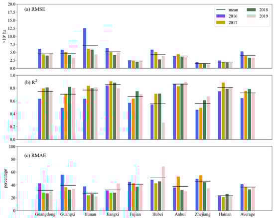 In addition, this method accurately estimated the areas of early rice and late rice compared to the available agricultural statistical data at the county level for all investigated provinces (Figure 6). The maps reproduce well the spatial variations of the planting area of paddy rice. For early rice in each province (Figure 7), the averaged R2 over three years of 2016-2019 ranged from 0.50 to 0.87, the averaged RMSE ranged from 1.53 to 6.94, and the average of RMAE ranged from 22% to 59%. For Guangdong, Guangxi, Hunan and Jiangxi Provinces, which occupies 85.61% of the planting area of early rice in China, the classification shows good performance according to three metrics (Figure 7). Fujian and Hubei Province show large classification errors at the county level (Figure 7). For example, the averaged RMAE in Fujian is more than 59%, and R2 is less than 0.50 (Figure 7). Among the four validation years (i.e., 2016–2019), 2016 shows the largest error at the county level (Figure 6).