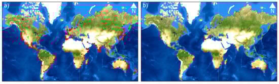 The Open Street Map (OSM) world shoreline and the Global Human Settlement Layer (GHSL), provided by the Joint Research Centre (JRC) [], constitute the remaining input data that the algorithm demands. The GHSL is a multitemporal information layer mapping human settlements and infrastructure for the time span 1975–2014. It has been derived from satellite imagery (predominantly Landsat) and a miscellaneous dataset including census data and volunteered geographic information. The data are processed automatically using evidence-based analytics and knowledge generated from spatial data mining technologies. It has global coverage and 38 m spatial resolution and can be retrieved from the GEE’s library.
