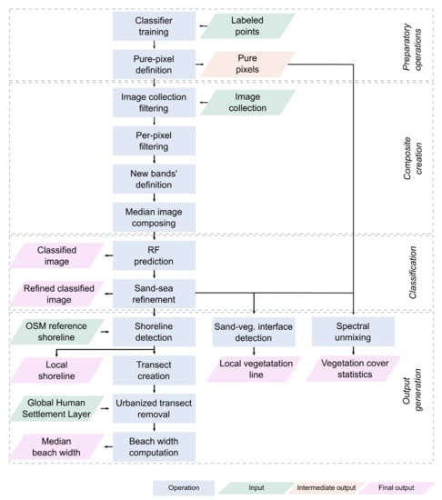 Algorithm’s workflow to classify satellite images and provide relevant information about coastal areas. Green boxes represent input, blue boxes represent operations, whereas orange and pink boxes represent intermediate and final output, respectively.