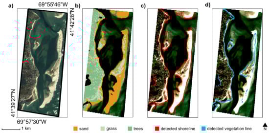To sum up, the algorithm provides three typologies of output for a given AoI (Figure 3a): (i) the classified map of the input AoI (Figure 3b); (ii) the transition boundaries between different land cover classes as derived by combining Otsu’s threshold, Canny’s edge detection, and Hough’s transform, e.g., the shoreline (Figure 3c) and the vegetation–sand interface (Figure 3d); (iii) numeric outcomes about the transversal width of the beach and the vegetated areas, and the grass cover statistics.