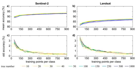 We assessed the accuracy achieved by the algorithm over both Sentinel-2 and Landsat collections. In all the tested cases, the mean and standard deviation of the accuracy reaches a constant value when each class has at least 700 points, which is much less than the number of the labeled datasets (Section 2.1). With more than 20 decision trees, the classification accuracy does not change significantly, and the optimal accuracy is achieved with 30–50 decision trees.