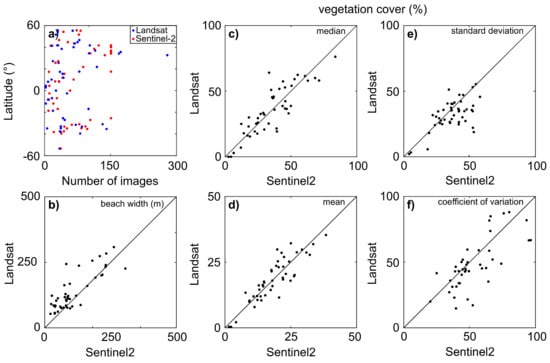 (a) Image collection size versus latitude for Landsat (blue dots) and Sentinel-2 (red dots). (b) Comparison between the Landsat- and Sentinel-2-derived median beach width (reported in meters). The main vegetation cover statistics expressed as a percentage: (c) median; (d) mean; (e) standard deviation; and (f) coefficient of variation.