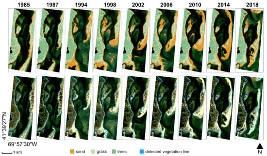 Although the main morphological and sand cover changes might be directly detected from RGB images, the algorithm offers an automated method to process the satellite images. Moreover, as it works on more bands than only RGB, it allows us to identify also those features, such as the transition line between sand and vegetation, that are not evident with the visible bands alone (lower panels in Figure 8). In the example reported in Figure 8, vegetation zonation in barrier islands generally follows the gradient that mirrors the species adaptation to salinity and resistance to floods, and significant morphological changes, such as the ones that occurred in 1987 and 2007, may dramatically alter the plant distribution and ecosystem functionality. The algorithm applied in this area may support the study of the time evolution of vegetated areas and the associated ecosystem dynamics in conjunction with the morphological shift.