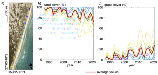 (a) Localization of ten points along the vegetation–sand interface at Cape Moreton (SE Australia) (Google Earth, 2021). Trend of sand (b) and grass (c) cover dynamics across the Landsat timespan. The line colors in the panels (b,c) refer to the point location indicated in the panel (a); the red lines show the average trend.