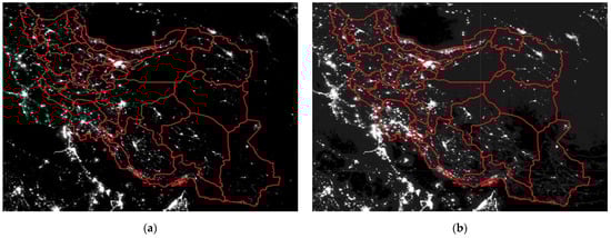 (a) NTL in Iranian provinces, 2013; (b) NTL in Iranian provinces, 2017. Source: own illustration using the files from [,].