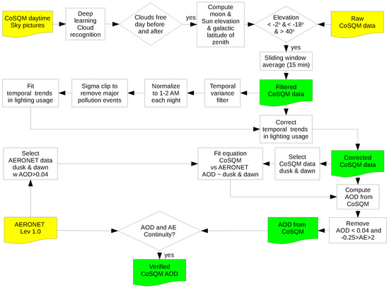 General methodology used to derive the aerosol optical depth out of the CoSQM cloud-free, moon-free and Milky Way-free night sky brightness. Boxes in yellow are input data, whereas green boxes are data produced using the method. The upper-left box mentioning the CoSQM daytime Sky pictures specifies that no nighttime pictures are taken because of the lack of sensitivity in low light of the RPi camera sensor.