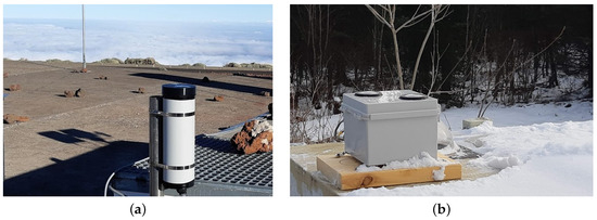 The CoSQM device. (a) shows version 1 of the CoSQM. That specific unit is installed at AEMET Izaña observatory (Spain). (b) shows the second version of the CoSQM. This unit is installed at Saint-Camille (Canada).