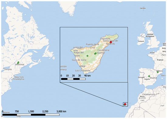 Three of the eight CoSQMs that form the network described in Table 2 were installed in AEMET facilities. This is the case for the stations at Santa Cruz de Tenerife (28.47N, 16.25W, 52 m a.s.l.), Izaña Observatory (28.31N, 16.50W, 2401 m a.s.l.) and Pico Teide (28.27N, 16.64W, 3552 m a.s.l.), located in Tenerife (Canary Islands, Spain), managed by the Izaña Atmospheric Research Centre (IARC) [14]. The subtropical location of this archipelago entails the existence of a strong temperature and moisture inversions in the lower troposphere [15], modulated by quasi-permanent subsidence conditions at this latitude as a result of the descending branch of the Hadley cell. As Carrillo et al. [15] found, one or two sharp temperature inversions or transition layers below the 700 hPa level can be found in the lower troposphere, limiting the humid and well-mixed marine boundary layer (MBL) to the dry and clean free troposphere (CFT) above. The top of the MBL, as an interface between these two very different air masses, is readily visible by the presence of quasi-permanent stratocumulus clouds frequent at this latitude, which have a critical role in preventing the arrival of anthropogenic and light pollution from lower altitudes. Another critical feature of Tenerife is its proximity to the African continent, entailing a strong influence of Saharan desert aerosols in the climatology of the three stations. The archipelago is located within the dust transport mainly during summer, as an elevated dust layer (the Saharan Air Layer or SAL) transported above the MBL at subtropical latitudes with a strong impact on the subtropical free troposphere over the North Atlantic [16,17,18]. Sporadic dust outbreaks can also affect the islands in winter, mostly restricted to lower levels, within the boundary layer [16,19]. These dust events are called “Calima”.