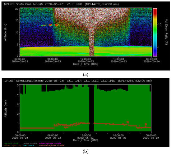 Lidar volume depolarization ratio and aerosol inversion for 23 May 2020, in Santa Cruz de Tenerife, extracted from https://mplnet.gsfc.nasa.gov/, accessed on 8 January 2021. (a) shows a stable VDR signal throughout the time interval, notably at dusk and dawn and which represents the ideal conditions for the AERONET-CoSQM correlation based on steady temporal conditions. (b) shows the aerosol top layer height (green), as well as the planetary boundary layer (PBL) height (terracotta). The height of the aerosols above the PBL makes this period a good candidate to evaluate the method’s sensitivity to high-altitude atmospheric components. The CoSQM-measured AOD must depend upon the total atmospheric vertical layer to be compared to the AERONET sun photometer measurements.