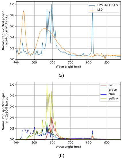 In order to estimate the effect of the typical sky spectrum in combination with the filters’ spectral transmittance on the evaluation of the effective wavelength of the different CoSQM bands, we proceed to the modeling of the sky spectrum in Santa Cruz de Tenerife. We used the light inventory definition for Santa Cruz de Tenerife ([26]) with a neutral ground reflectance of 10% and the atmospheric content defined by the average AOD and AE (0.196 and 0.504, respectively) of the entire filtered dataset, as explained in the following subsection. This simulated sky spectrum is shown in Figure 6a. The minimal value of that spectrum represents the contribution of the natural star background. This spectrum has been adjusted using a city sky spectrum acquired in Huntington Beach (USA) and by scaling it to fit the differences between the sky brightness values given by the New World Atlas of Light Pollution [27] for the two sites. Then, to find the typical spectral signal detected by the CoSQM, we multiplied that spectrum with each band’s spectral transmittance from the CoSQM (3). The resulting effective spectral response is shown in Figure 6b. This result corresponds to a lamp’s inventory, which contains 90% high-pressure sodium (HPS), 5% metal halide (MH) and 5% LED 4000K. Figure 6c shows the effective spectral response for a city solely using LED lamps with a color temperature of 4000K. The effective wavelength of each CoSQM band is then estimated using a weighted mean of the product of the simulated sky spectrum with the band’s sensitivities. That process gave approximate values of red, green, blue, and yellow (RGBY) of 652 nm, 599 nm, 532 nm and 588 nm, respectively. Even if the spectrum of the sky changes slightly from one day to another, it will not significantly influence the calculated effective wavelength. According to our simulations, the effective wavelength cannot change by more than 10 nm under a change of lighting inventory. This is because city lighting relies only on a few different technologies (e.g., HPS, MH, LED). Therefore, these values were used as the CoSQM bands’ wavelengths in this particular case. It must be noted that this methodology must be redone for every site since the lamp inventory depends on the location.
