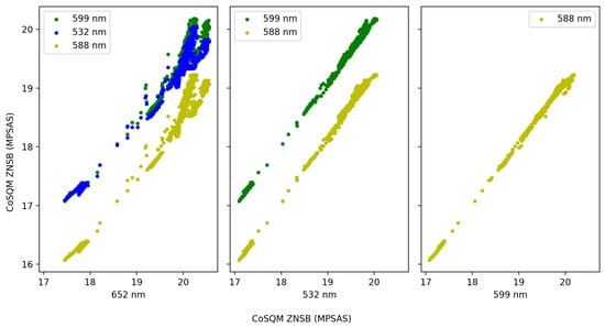 CoSQM band correlations. The correlation plots show that the best distinction is obtained with the red band. Considering that the most different band in terms of spectral sensitivity is the blue filter, only this one has been conserved for the rest of the work.