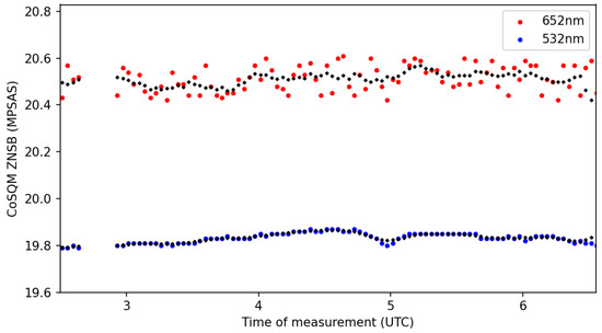 Figure 9. Different variance behaviors of the CoSQM filtered data after correcting for the lighting trends. The Figure shows the important differencse between high SNR values (blue band, 532 nm) and low SNR values (red band, 652 nm) for the night of 24 January 2020. Black symbols represent the data after applying a 15 min sliding average window over each associated color band. - Visual analysis: The data points filtered by the temporal variance filter can sometimes leave points that are most probably caused by a quasi-uniform cloud coverage of the entire CoSQM sensor (see Figure 8, right column, for an example). These points are in some cases indistinguishable from clear sky measurements; thus, a visual inspection of the sky pictures is needed. These points are first located in time in the entire dataset of CoSQM measurements and the specific images of the pi cam of the associated evening and the next day are visually examined and discarded if any of the two shows any definitive presence of clouds. A total of 13 nights of measurements were removed following this step, which represents 4% of the resulting nights contained in the dataset at this step.