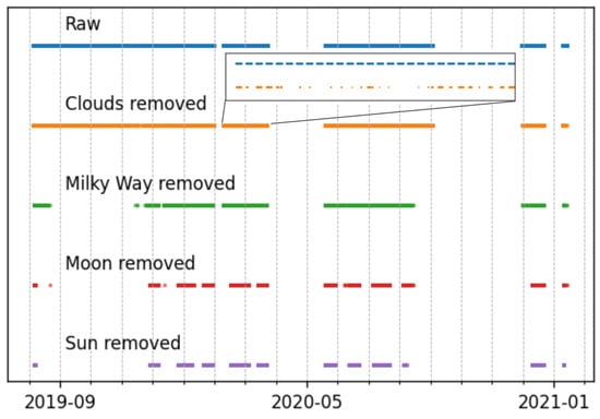 The scattering and refraction effects of the sun’s rays with the atmosphere near sunset and sunrise increase the sky brightness measured by the CoSQM. The filtering of this contribution is assessed by computing the sun’s elevation angle and removing all data points where this angle is higher than 18 degrees below the horizon. The Skyfield Python library was used to compute these angles [28]. This step of the filtering left 4987 of 100,160 measurements (5.0%). This small contribution to filtering is a consequence of the temporal variance filter that removes the rapidly changing ZNSB data points at sunset and sunrise. The initial evaluation indicates that this value can be extended up to −15 degrees for all sites located on Tenerife before an important sky brightness variation is measured. However, this higher angle only adds 2% of data points. It is not yet confirmed if other sites also show this behavior. Figure 1 specifies a sun angle filtering value of −18 degrees for generality purposes, since this is the most restrictive value in astronomy and is used in this work. Figure 10 shows the data reduction throughout the above defined filters. The initial measurements from the raw data were caused by instrument and/or network failures.