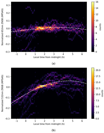 Since the ZNSB depends greatly on light pollution sources close to the CoSQM site [29] and scattered light from light fixtures is the principal source of the signal, the temporal trends of lighting usage must be determined to correct for variations in sky brightness associated with human activity or light usage. This information can be extracted directly from the CoSQM filtered data (before the sliding window average step shown in Figure 1). To do so, CoSQM data are evaluated individually for ZNSB as a function of local time of night for each day of week, week and month of year and season. Variations between intervals are evaluated and the longest satisfying interval is chosen to simplify the relationship, while not overfitting the data. This is possible through the use of a low-order polynomial fit which is iteratively applied while excluding the data points that exceed one standard deviation from the resulting fit. This process ends when the final standard deviation converges to 0.1% of the previous obtained value, indicating that the removal of more data points is useless. In this way, we limit the fit sensibility to the random events that do not represent local lighting trends and are potentially caused by the presence of aerosols; thus, they should not have a major effect on the fit function. This iterative fit influences the ZNSB correlation points, which in turn influences the AOD from the ZNSB product. The iterative fit caused a mean variation of 6% on the final AOD values compared to a simple 3rd order fit of all data, where the majority of the modified values are related to ZNSB measurements taken before midnight (where the outliers of Figure 11 are mainly located). The impact of the iterative fit depends on the outlying points for a given dataset; it is then expected to vary at other locations. Finally, the nighttime-dependent contribution to ZNSB is removed from the filtered data. Following this evaluation, we compute a 3rd order correction per band, which is applied to the entire data set. The ZNSB is first averaged between 1:00 A.M. and 2:00 A.M. local time for each night. Each night is then normalized with this average and a 3rd-order function is fitted to the result. The fitted function is then subtracted from the ZNSB data as shown on Figure 12a for a specific night. For these specific datasets, the 1:00 A.M. to 2:00 A.M. time interval showed the least variations of ZNSB throughout the nights; therefore, it was chosen as the reference to normalize the ZNSB trends. This interval may vary between sites, but similar characteristics of lighting trends would probably be found in near cities, since lighting trends are correlated to population habits and customs and it is reasonable to assume that the darkest moment of the night happens in its middle. This interval is also the most likely to give accurate AOD values since it presents the least anthropogenic variations in ZNSB. The Figure also shows major differences in the fit parameters for the 644 nm channel compared to the others. This can be caused by a majority of street lighting technologies that present a lower color temperature such as high-pressure sodium and phosphor-converted amber LED bulbs (redder technologies). Compared to privately owned lighting, the public portion has a steadier contribution to sky glow since the street lights only turn on once per night. The increase in ZNSB around 4:00 A.M. can be explained by the private lighting habits of near sources such as bars, restaurants and other nightlife industries that typically close around that time in Tenerife. Finally, the lower end-of-night reduction in ZNSB for the 644 nm band seems to indicate an opposite relation compared to the results presented in [30], where cloudless nights’ ZNSB variations were observed to decrease more in the longer-wavelength bands than the smaller. The results of Kyba et al. [30] were obtained in Berlin, Germany.