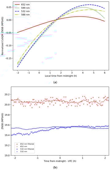 Correction for the light usage trends. (a) shows a comparison of the correction functions for each CoSQM color filter band. (b) shows an example night of CoSQM ZNSB data for the night of 23 May 2020, for 2 cases: Filtered data (y symbols) for the presence of the sun, moon, Milky Way and clouds, as described in Section 2.4. Circles are filtered data, in which the high variance is removed with a sliding window, as described in Section 2.4.5 after applying the correction for light usage trends, as described in Section 2.4.6.