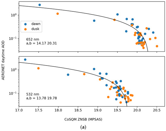 Following the filtering steps, only a fraction of the data can be used to derive a relationship between AOD and ZNSB. Indeed, the AOD variation period required by the proposed technique must be greater than the interval between the last AERONET AOD measurement (typically 8:00 P.M.) and the first CoSQM measurements after filtering steps are applied (typically 10:00 PM). This implies that only a subset of the remaining data points are valid correlation candidates; in other words, successive nights and days are necessary to obtain reasonable results. The chosen method consists of the correlation of an average of AOD values around 5 h before dawn to an average of ZNSB values around 5 h after dawn (and inversely for dusk). Following the assumption that AOD variations happen on a bigger time scale than this 10 h interval limit, the ZNSB measured after dawn with the CoSQM should be correlated to the AOD measured before dawn with the CE318-T and inversely for dusk. This approach is intrinsically optimized for steady-state AOD conditions (i.e., where the AOD changes slowly). Dispersion of the points would be caused by rapid fluctuations of AOD happening close to dusk and dawn, which is not desirable. These points must be removed since there is no way to confirm that the correlation is in fact valid at these moments in time (AOD changes before the first ZNSB measurements are made, reducing the relation’s validity).