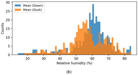 Relationship between ZNSB and the daytime AOD. (a) shows the correlation plot between AOD from the CIMEL CE318-T sun photometer and ZNSB from the CoSQM multispectral sensor for the Santa Cruz de Tenerife location. The filtered and averaged data are fitted using Equation (2). Parameters a and b correspond to the fitted parameters in this equation. The dusk and dawn legend specifies the period represented by each value. (b) shows the relative humidity histogram at sunset and sunrise for the year 2020 in Santa Cruz de Tenerife. The higher values associated with sunrise (dawn) explain the difference in the plotted points shown in (a) since higher relative humidity may be associated with higher AOD values.